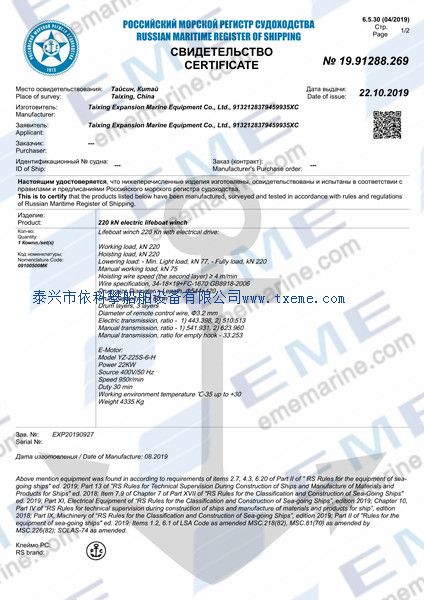资料主题:220kN electric lifeboat winch with RS certificate 浏览次数:[ 24 ]