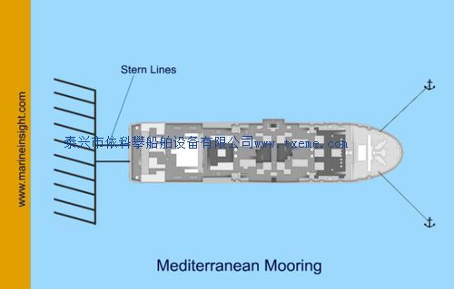 地中海系泊:对于这种类型的系泊,使用发动机运动来确定和接近预先计算的位置。弓首先是向泊位倾斜,右舷锚放在那个位置。之后,发动机运行后,港口锚点在指定的地点放开。这艘船倒塌,向右舷摇摆。因此,当船只靠近码头时,船只被两个锚固定。船尾线然后通过。使用锚索使紧固件保持紧密。船舶的定位是这样的,系泊在每个锚上完成约四个枷锁。通常,潮汐用于控制船舶向码头的漂移,同时通过在其中一个锚点上沉降或支付来定位船舶。阅读更多关于地中海停泊在这里。